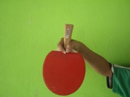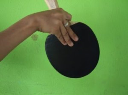 3. วางนิ้วชี้ขนานไปตามแนวขวางของส่วนปลายโคนไม้บนหน้าไม้อีกด้านหนึ่ง โดยที่หน้าไม้ที่วางนิ้วชี้นี้จะเป็นด้านสำหรับการตีลูกหลังมือ และงอนิ้วที่เหลืออีก 3 นิ้ว คือ นิ้วกลาง นิ้วนาง และนิ้วก้อยกำรอบด้ามไม้