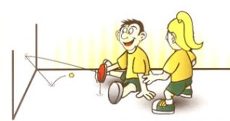 จาก นั้นลองให้นักเรียน หัดตีลูกปิงปองกับผนังโดยการนั่ง เริ่มต้นจากการใช้ด้านหลังมือก่อน(ดังรูป) นักเรียนควรพยายามให้ตีโต้ได้หลายๆ ลูกขึ้น