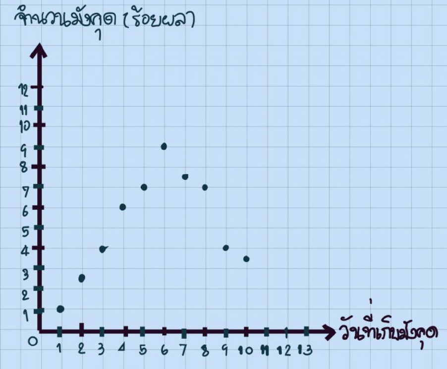 ตอบ จำนวนมังคุดที่เก็บส่งขายได้ใน 6 วันแรก เพิ่มขึ้นโดยตลอด และมีจำนวนมากที่สุดถึง 900 ผล ในวันที่ 6 หลังจากนั้นมีจำนวนลดลงเรื่อย ๆ จนถึงวันที่ 10