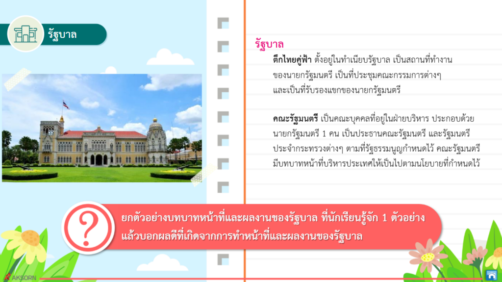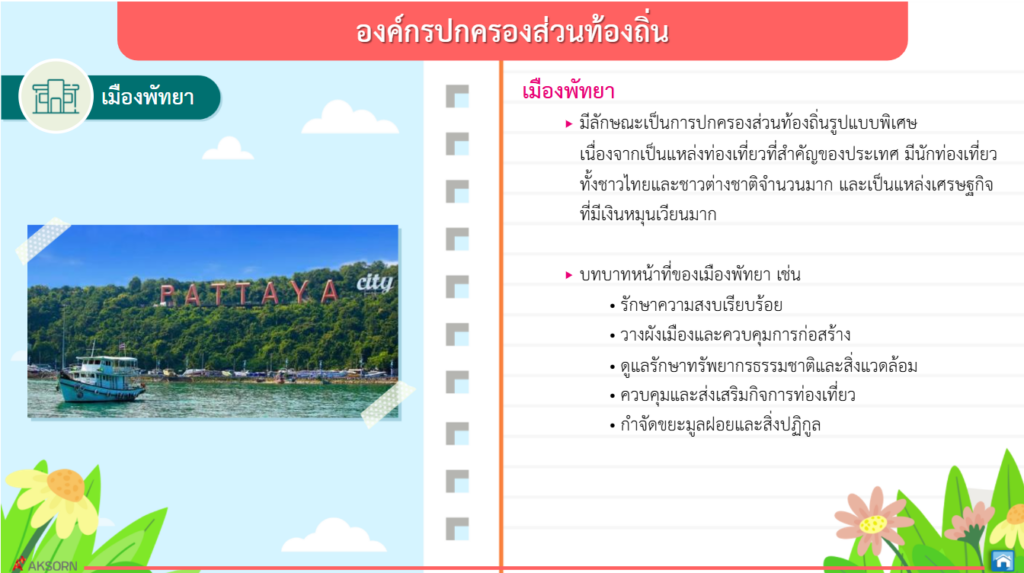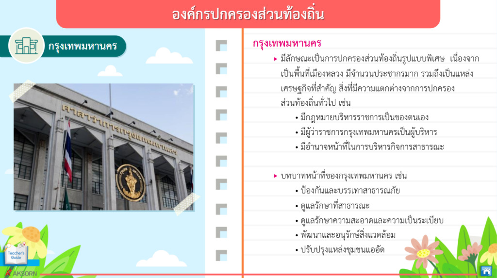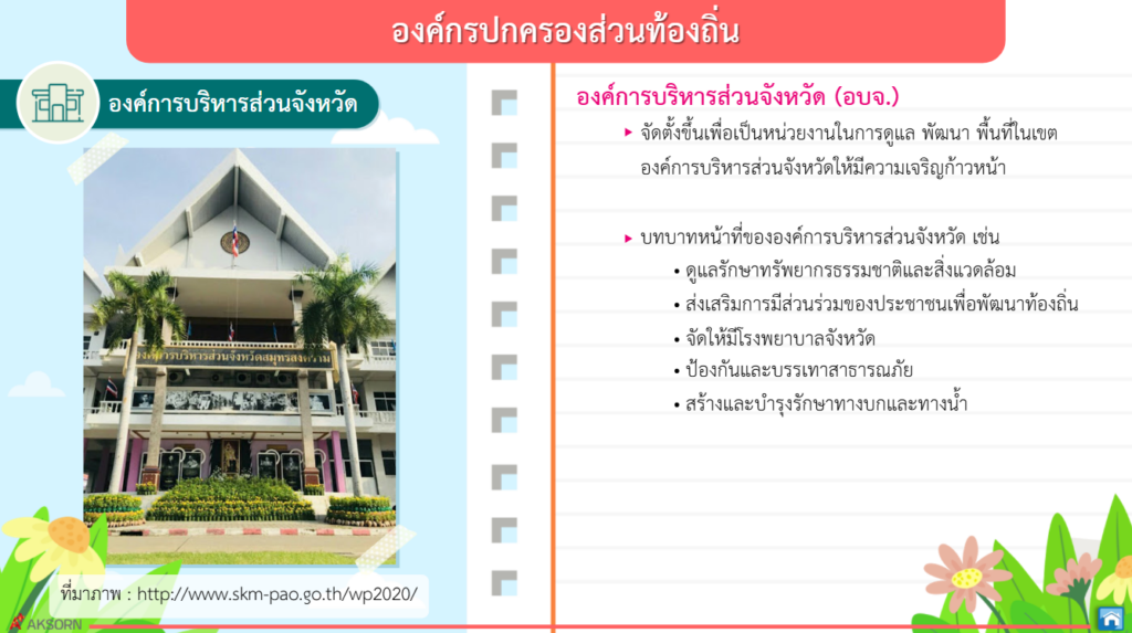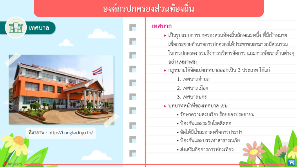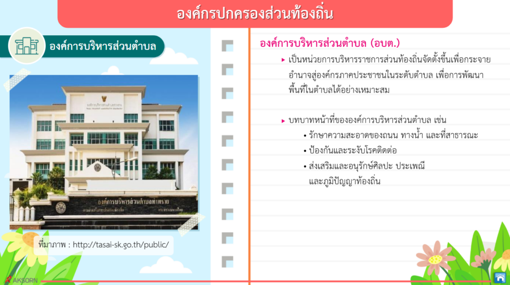 องค์กรปกครองส่วนท้องถิ่นและรัฐบาลต่างก็มีบทบาทหน้าที่สำคัญในการบริหารราชการแผ่นดินและการบริหารส่วนท้องถิ่น ประชาชนทุกคนควรมีส่วนร่วมในกิจกรรมต่างๆ ที่ส่งเสริมประชาชนไทยในท้องถิ่นและประเทศ ใช้สิทธิเลือกตั้งตามระบอบประชาธิปไตย ซึ่งจะส่งผลต่อความมั่นคงการปกครองระบอบประชาธิปไตย