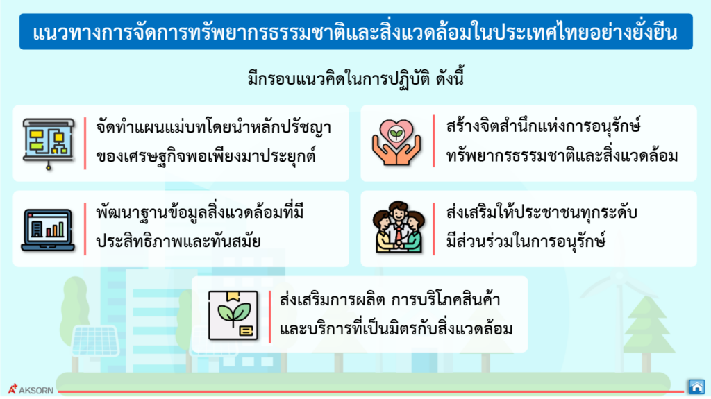 แนวทางการจัดการทรัพยากรและสิ่งแวดล้อมที่ยั่งยืนในประเทศไทยแตกต่างกันไปตามลักษณะทาง กายภาพและการดำเนินชีวิต