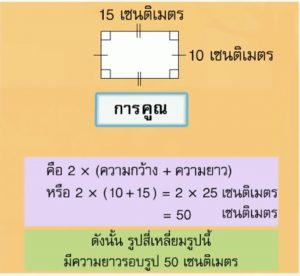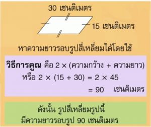 ความยาวรอบรูปสี่เหลี่ยมด้านขนาน = 2 x (ด้านกว้าง + ด้านยาว)