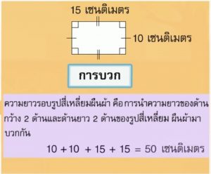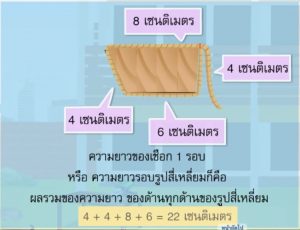 ความยาวรอบรูปสี่เหลี่ยมพื้นผ้า = 2 x (ด้านกว้าง + ด้านยาว)