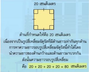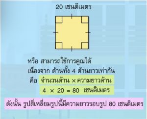ความยาวรอบรูปสี่เหลี่ยมจตุรัส = 4 x ด้าน