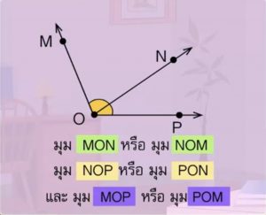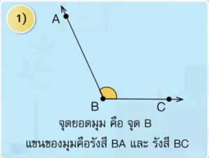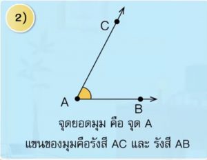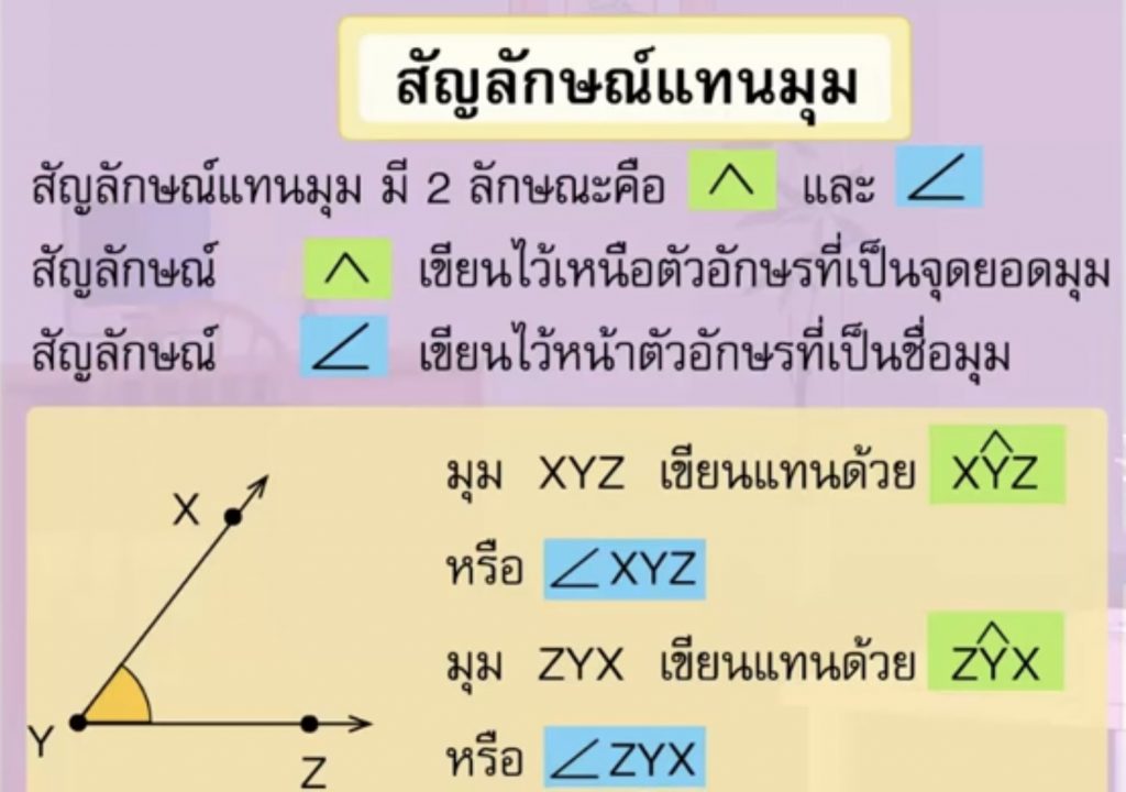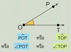 - การเขียนสัญลักษณ์แสดงมุมให้เขียน ∧ อยู่เหนือตัวอักษรที่เป็นจุดยอดมุม