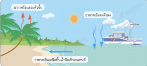 – อากาศเหนือพื้นดิน ลอยตัวสูงขึ้น อากาศเหนือพื้นน้ำเข้ามาแทนที่