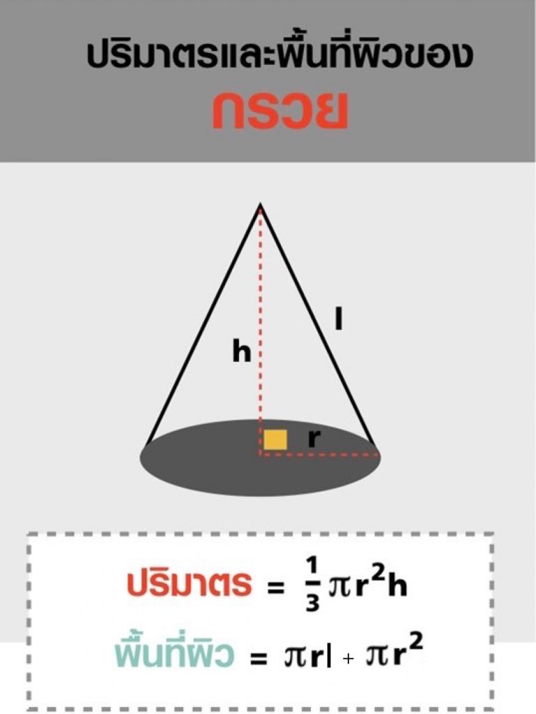 ปริมาตรของกรวย = 1/3 x (22/7 หรือ 3.14) x รัศมียกกำลังสอง x สูงตรง