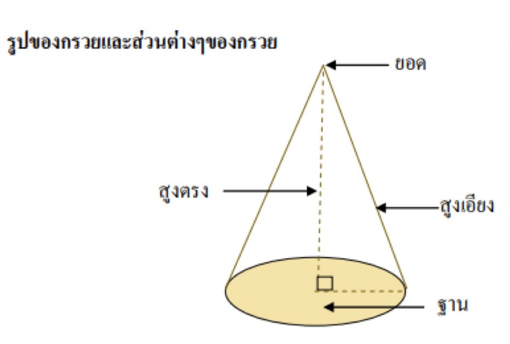 รูปเรขาคณิตสามมิติที่มีฐานเป็นวงกลม มียอดแหลมที่ไม่อยู่บนระนาบเดียวกันกับฐานและเส้นที่ต่อระหว่างจุดยอดและจุดใดๆ บนขอบของฐานเป็นส่วนของเส้นตรง เรียกรูปเรขาคณิตสามมิตินั้นว่า กรวย