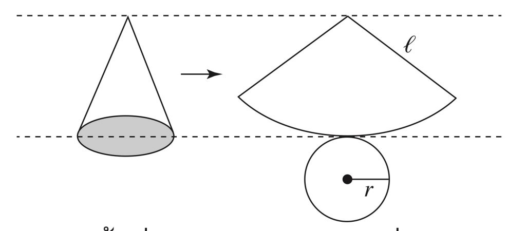 • สมมติว่าเราตัดกรวยที่ทำจากกระดาษ โดยตัดตามขอบวงกลมที่เป็นฐานและในส่วนที่เป็นผิวข้างให้ตัดจากขอบไปยังจุดยอดของกรวย จะได้รูปดังนี้