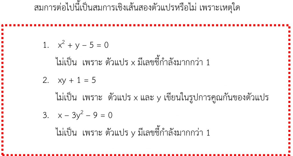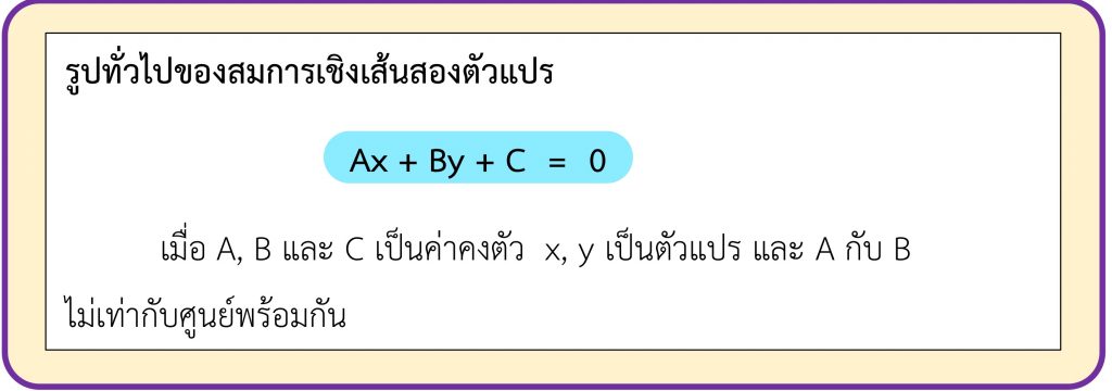 สมการที่มีตัวแปรสองตัวแปร โดยท่ีเลขชี้กำลังของตัวแปรแต่ละตัวเท่ากับ 1 และไม่มีการคูณกันของตัวแปรและสัมประสิทธิ์ของตัวแปรไม่เป็นศูนย์พร้อมกัน เรียกว่า สมการเชิงเส้นสองตัวแปร